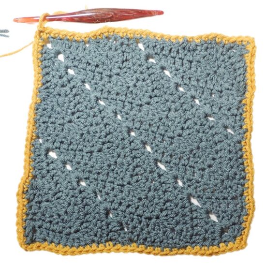 NOTE: If you want to block at this point, block the square to 9″. You will still need to block the square again when it’s complete.