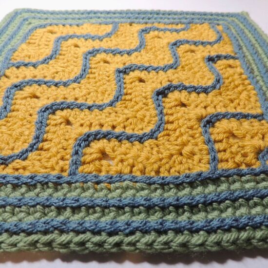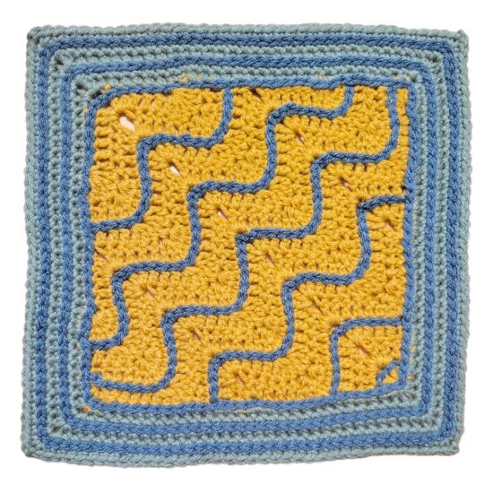 Diagonal double crochet waves traced with surface crochet are surrounded by a thick border in this striking crochet block. The High Tide Square is suited for crocheting in a single color, or in many colors. See what combinations you can come up with and create and entire blanket, or choose just your favorite and combine it with other crochet square patterns.